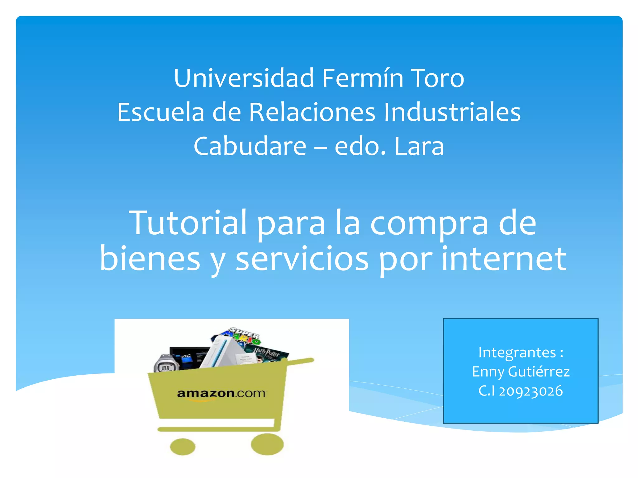 Este documento proporciona un tutorial en 11 pasos para comprar bienes y servicios en Amazon. Explica cómo buscar productos, agregarlos al carrito de compras, crear una cuenta, ingresar la dirección de envío y de pago, seleccionar el método de envío y pago, revisar el pedido y realizar la compra. También incluye 10 recomendaciones para comprar de forma segura en internet.