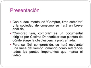 El documento resume un documental llamado "Comprar, tirar, comprar" que explora el origen de la obsolescencia programada. Explica que en el pasado, los productos como bombillas y electrodomésticos duraban mucho más que ahora debido a que estaban diseñados para ser más duraderos. Sin embargo, los comerciantes se dieron cuenta que podían generar más ganancias diseñando productos para que dejaran de funcionar más rápido y forzando a los consumidores a reemplazarlos con frecuencia.