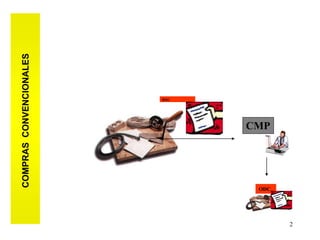 El documento describe el proceso convencional de compras, que incluye la generación de una orden de compra por parte del departamento de compras, la recepción y almacenamiento del producto en el almacén, y el pago al vendedor una vez recibida la factura.