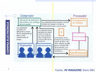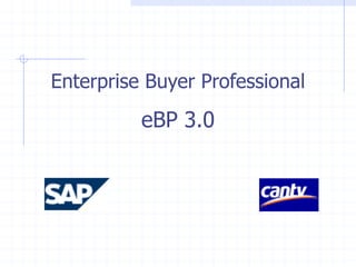 El documento describe el software Enterprise Buyer Professional (eBP) de SAP para la compra electrónica. Explica que eBP permite a los usuarios buscar requerimientos en un catálogo, elaborar requisiciones y hacerles seguimiento a través de un flujo de trabajo de aprobaciones, resultando en órdenes de compra electrónicas enviadas a los proveedores. También destaca que eBP integra sistemas de compra, tiene un enfoque orientado al cliente y los procesos de cliente-proveedor, y prepara a las empresas para los negoci