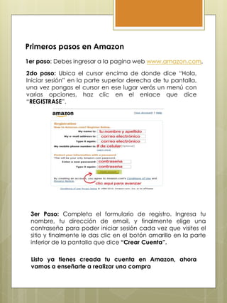 Este documento proporciona un tutorial en 8 pasos para realizar compras en Amazon.com. Explica cómo crear una cuenta de usuario, agregar productos al carrito de compras, ingresar la dirección de envío y los detalles de pago, y finalizar la compra. El resumen guía al lector a través del proceso completo de compra en línea en Amazon desde el registro inicial hasta la confirmación del pedido.
