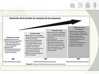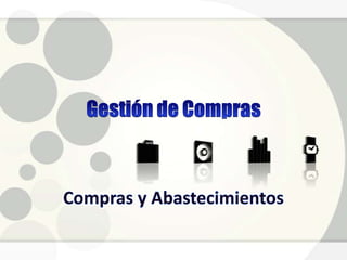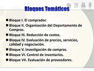 El documento describe los aspectos fundamentales de la gestión de compras y abastecimientos en una empresa. Se divide en 7 bloques que cubren temas como la organización del departamento de compras, la reducción de costos a través de técnicas como el análisis de valor, la evaluación de proveedores, precios y calidad. Además, se explica que la gestión de compras es un proceso cíclico clave para el abastecimiento continuo de la empresa y el soporte de todas sus operaciones.