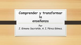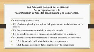 Este documento resume las principales teorías sobre las funciones sociales de la escuela, los procesos de enseñanza y aprendizaje, y el aprendizaje escolar. Argumenta que la escuela debe pasar de la mera reproducción del conocimiento a la reconstrucción crítica del conocimiento y la experiencia. También explora diferentes enfoques de la enseñanza como transmisión cultural, desarrollo del pensamiento y la producción de cambios conceptuales. Finalmente, analiza la evaluación en la enseñanza y su función en el proceso de enseñanza-