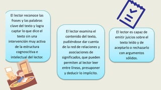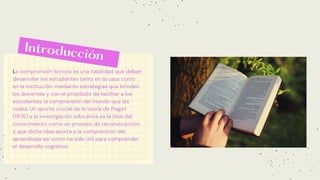 El documento habla sobre la comprensión lectora, definida como la habilidad para comprender, usar y reflexionar sobre diferentes formas de lenguaje escrito. Explica que existen tres niveles de comprensión lectora: literal, inferencial y crítico. Además, describe el método SQ3R para mejorar la comprensión lectora, el cual consiste en examinar, preguntar, leer, repetir y repasar un texto.