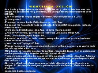 Lucía no disfrutó de la película que vio con sus amigos Ana y Jorge porque considera que tenía demasiadas escenas de violencia. Sus amigos disfrutaron la película y creen que el contenido violento es inofensivo. Lucía teme que las películas violentas puedan volver a la gente más agresiva, pero sus amigos no comparten esta opinión.