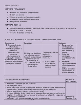 El documento resume las actividades de un día viernes en una escuela primaria. Incluye oraciones de agradecimiento, recitación de poesía, canto y simulacro de sismo. También describe una lección sobre estrategias de comprensión lectora, incluyendo el uso de subrayado y diccionario para inferir significados. La lección concluye con una lectura y actividades sobre el Día del Campesino.