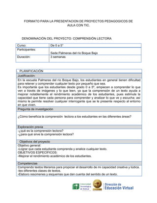 El documento presenta un proyecto pedagógico sobre comprensión lectora para estudiantes de 0 a 5° grado. El proyecto busca mejorar la comprensión lectora de los estudiantes a través de tres semanas de actividades como interpretación de imágenes, lectura de textos cortos y largos, y uso de herramientas digitales. El proyecto detalla la justificación, objetivos, metodología, cronograma y forma de evaluación de las actividades propuestas.