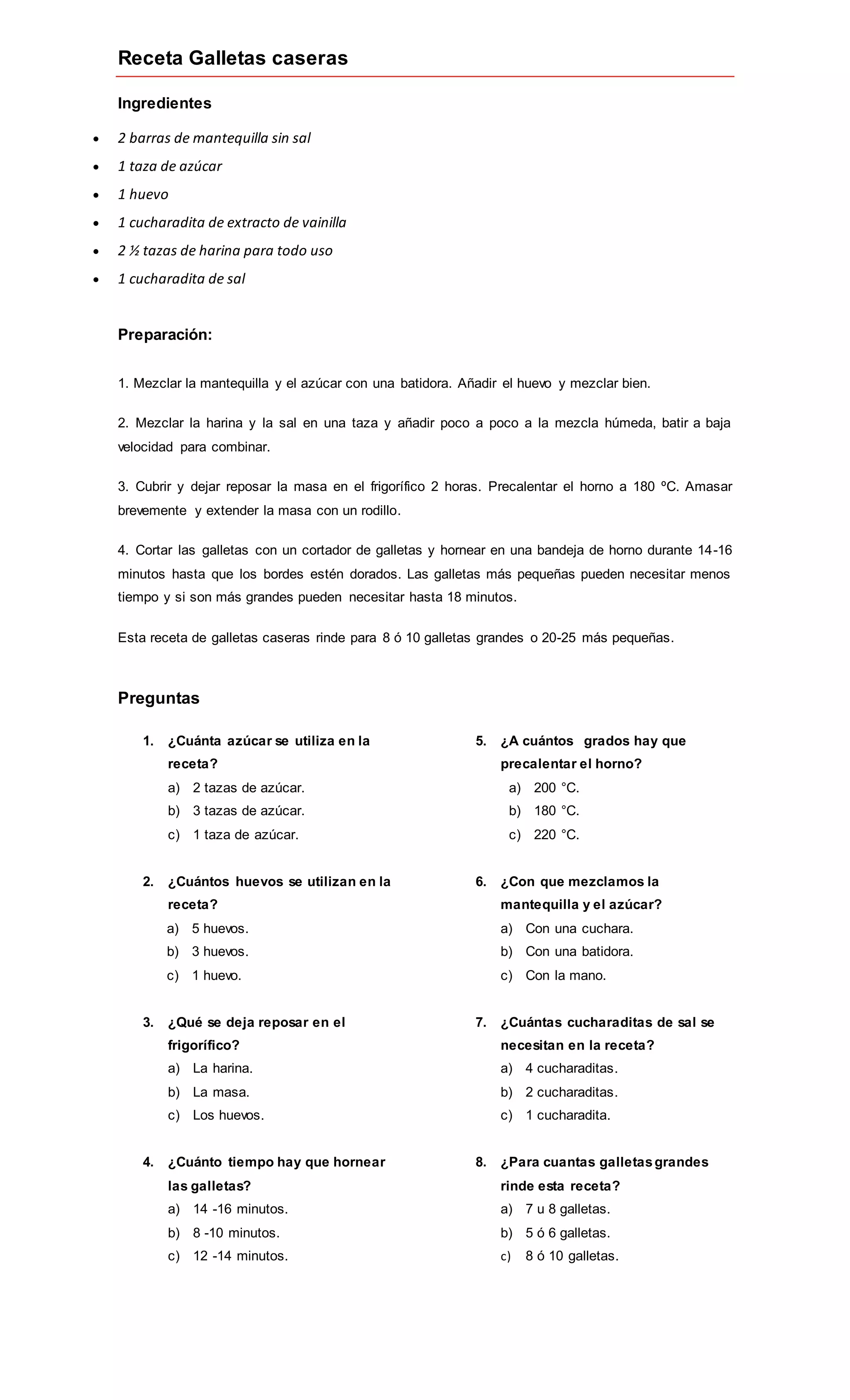 La receta incluye mantequilla, azúcar, huevo, vainilla, harina y sal. Se mezclan los ingredientes húmedos y se añade la harina a la mezcla. Luego se deja reposar la masa en el frigorífico por 2 horas, se extiende y corta, y se hornea a 180°C durante 14-16 minutos. La receta rinde para 8-10 galletas grandes.