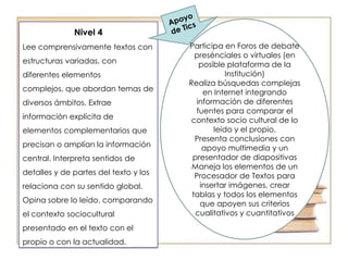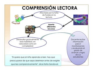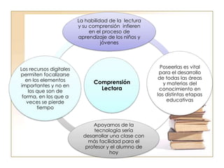 El documento discute el uso de las TIC para mejorar la comprensión lectora en los estudiantes de hoy. Explica que los estudiantes han crecido con la tecnología y les gusta usar múltiples herramientas digitales al mismo tiempo. También proporciona ejemplos de herramientas TIC como videos educativos y unidades didácticas digitales que pueden ayudar a desarrollar la comprensión lectora de manera gradual y hacer que la lectura sea más atractiva para los estudiantes.