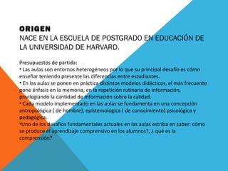 La teoría de la comprensión nace en la Escuela de Postgrado en Educación de la Universidad de Harvard. Los miembros del Proyecto Zero buscaron definir la comprensión, desentrañar su naturaleza y formular un marco de trabajo basado en la Enseñanza para la Comprensión. Proponen que la comprensión implica desempeños flexibles que demuestren y aumenten la comprensión. Además, destacan cuatro conceptos claves: temas o tópicos generativos, metas de comprensión, desempe