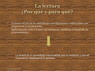 Este documento discute la importancia de la lectura y la comprensión lectora. Explica que la lectura es fundamental para el desarrollo intelectual y favorece habilidades como comunicarse, pensar críticamente y argumentar lógicamente. También analiza diferentes métodos para evaluar la comprensión lectora, como preguntas abiertas, de verdadero/falso y opciones múltiples, e identifica ventajas y desafíos de cada método.