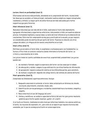 La comprensión lectora es el proceso de entender y relacionar las ideas de un texto con el conocimiento previo del lector. Implica reconocer palabras, frases y el significado global del texto, pero no siempre se logra comprender correctamente. La comprensión ocurre en diferentes niveles, desde reconocer información explícita hasta realizar inferencias, juicios críticos o respuestas emocionales.
