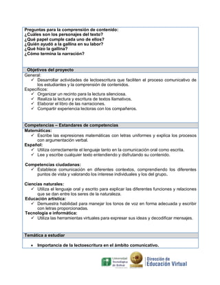 El documento presenta un proyecto pedagógico para fortalecer la comprensión lectora en estudiantes de 2o y 3o grado a través de actividades de lectoescritura. El proyecto incluye tres objetivos principales: 1) organizar un espacio para la lectura silenciosa, 2) realizar lectura y escritura de textos atractivos, y 3) elaborar un libro con narrativas estudiantiles. Se proponen tres actividades clave como parte del plan de trabajo.