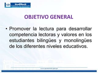 Este documento presenta las estrategias y métodos para promover la lectura y desarrollar competencias lectoras en estudiantes. Su objetivo general es fomentar la lectura para mejorar las habilidades de lectura y valores. Explica que leer bien significa comprender, extraer información y reflexionar sobre los textos para lograr metas personales. También describe las estrategias lectoras, formas de medir la velocidad y comprensión lectora, y cómo crear un ambiente que estimule la lectura en el aula.