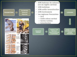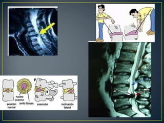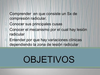 Este documento define el síndrome de compresión radicular, sus causas, mecanismos y manifestaciones clínicas. Brevemente, el síndrome ocurre cuando los nervios raquídeos se ven dañados por factores mecánicos, isquémicos o inflamatorios, causando dolor intenso. Las causas más comunes son hernias discales, tumores, infecciones o procesos degenerativos. Los síntomas varían dependiendo de la localización de la lesión radicular y pueden incluir dolor, pérd