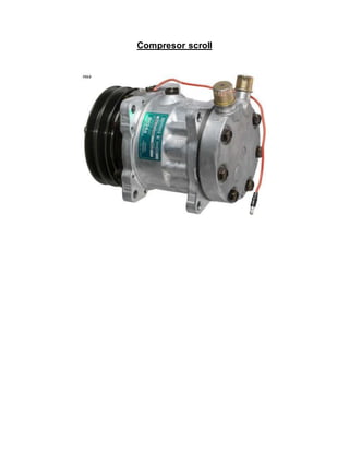Este documento describe el funcionamiento de un compresor scroll. Explica que utiliza dos espirales, una fija y otra móvil, para crear bolsas de gas que son comprimidas a medida que la espiral móvil se mueve en órbita alrededor de la fija. Detalla que el proceso de compresión involucra tres fases - aspiración, compresión y descarga - donde el volumen de las bolsas de gas se reduce progresivamente hasta ser expulsado.