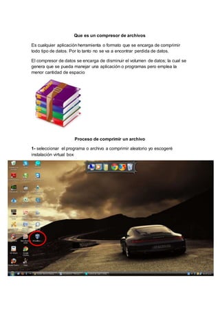 Este documento describe los procesos de compresión, descompresión y almacenamiento de archivos en un servidor de archivos. Explica cómo comprimir un archivo en WinRAR, descomprimirlo, asignarle una contraseña, dividirlo en partes y cargarlo a un servidor como MEGA para su almacenamiento y descarga posterior.