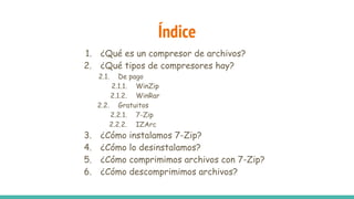 Este documento describe los tipos de compresores de archivos, incluidos compresores gratuitos como 7-Zip e IZArc, y de pago como WinZip y WinRar. Explica cómo instalar y usar 7-Zip para comprimir y descomprimir archivos en pocos pasos fáciles.