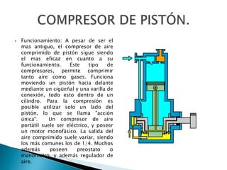 Este documento describe el funcionamiento y usos de los compresores de aire de pistón. Explica que estos compresores funcionan moviendo un pistón hacia adelante y hacia atrás dentro de un cilindro para comprimir aire o gases. Los compresores de pistón de efecto simple se usan comúnmente en talleres para inflar neumáticos u operar herramientas, mientras que los de efecto doble se usan para comprimir gases a altas presiones. También proporciona consejos para seleccionar un compresor de aire apropi