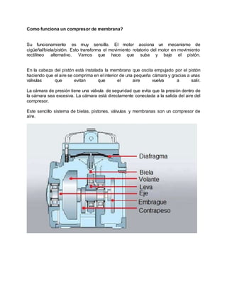 Los compresores alternativos funcionan mediante el movimiento alternativo de pistones que comprimen el aire dentro de cilindros. Los compresores de diafragma son un tipo de compresor alternativo que usa membranas elásticas en lugar de pistones para comprimir el aire, evitando el contacto del aire con piezas metálicas y lubricantes. Estos compresores producen aire más puro y requieren menos mantenimiento que otros tipos de compresores alternativos.