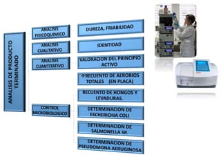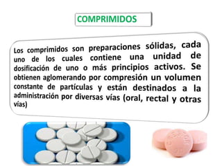 El documento describe los diferentes tipos de comprimidos, su composición, ventajas y desventajas. Explica los métodos de preparación de comprimidos como compresión directa, granulación húmeda y granulación seca. También detalla los controles de calidad microbiológicos y las buenas prácticas de manufactura para la producción de comprimidos.