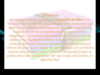 La compresión de datos reduce el volumen de datos almacenados mediante la representación de la información utilizando menos espacio, buscando repeticiones en las series de datos y almacenando solo el dato junto con el número de veces que se repite. La descompresión es el proceso inverso a la compresión, donde la información comprimida se descomprime para poder ser accedida, leída o modificada, generalmente usando el mismo programa que se utilizó para comprimirla originalmente.