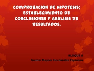 Este documento describe los pasos clave en la comprobación de hipótesis y el análisis de resultados en una investigación. Explica cómo formular hipótesis, diseñar y ejecutar pruebas, analizar datos, e inferir conclusiones. También cubre cómo establecer conclusiones en la introducción, desarrollo y conclusión de un trabajo de investigación, así como el uso de anexos como apéndices y glosarios.