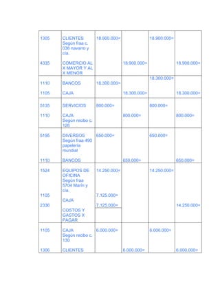 Este documento es un comprobante contable de la empresa tecno industrias LTDA fechado en abril de 2012. Detalla las cuentas por cobrar y pagar de la empresa, incluyendo transacciones con clientes, proveedores, bancos y gastos. El balance total de debe y haber es de $281'430.000.