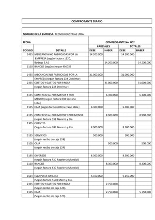 Este comprobante diario registra varias transacciones financieras de la empresa Tecnoindustrias Ltda. durante un día, incluyendo la compra de mercancías, pagos a proveedores, ingresos de clientes, gastos de personal y honorarios. En total, registró $149,450,000 en débitos y créditos.