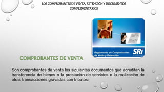 Este documento resume los diferentes tipos de comprobantes de venta, documentos complementarios y comprobantes de retención de acuerdo a la legislación ecuatoriana. Entre los comprobantes de venta se encuentran facturas, notas de venta, liquidaciones de compra de bienes y servicios, tiquetes de máquinas registradoras y boletos. Los documentos complementarios son las notas de crédito, notas de débito y guías de remisión. Finalmente, los comprobantes de retención acreditan las retenciones de impuestos realizadas