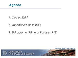 Este documento presenta una introducción al concepto de responsabilidad social empresarial (RSE). Explica brevemente el origen histórico de la RSE a través del ejemplo de Andrew Carnegie. Luego resume los principales enfoques y definiciones de RSE, así como sus beneficios potenciales para las empresas. Finalmente, propone un programa llamado "Primeros Pasos" para ayudar a las empresas a implementar prácticas de RSE.
