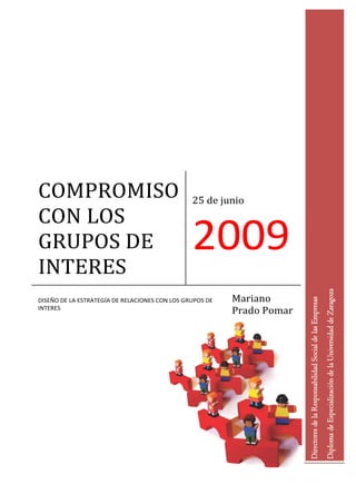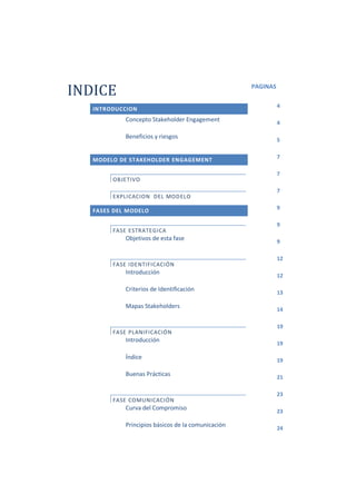 El documento aborda la estrategia de compromiso con los grupos de interés (stakeholders) como un proceso continuo y estratégico en las relaciones empresariales. Se destaca la importancia de identificar, planificar y comunicarse efectivamente con estos grupos para mejorar la gestión de riesgos, la reputación corporativa y generar valor a través del diálogo y la colaboración. Además, se presentan fases y herramientas para implementar un modelo de stakeholder engagement que permita satisfacer las expectativas de los grupos y adaptar las estrategias empresariales.