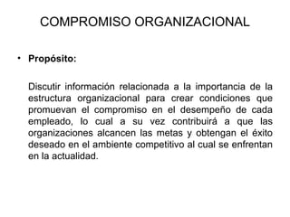 Este documento discute la importancia del compromiso organizacional para que las empresas alcancen sus metas. Define el compromiso como el grado en que un empleado se identifica con la organización y participa en su trabajo. Explica que el compromiso depende de factores como la identificación con la empresa, el sentido de pertenencia y la lealtad. También señala elementos que las organizaciones pueden fomentar para aumentar el compromiso como el interés en el bienestar de los empleados y brindar oportunidades para el desarrollo profesional.