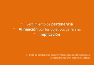 El documento habla sobre el compromiso en el lugar de trabajo. Explica que el compromiso está relacionado con la pertenencia, los objetivos de la organización e implicación. También depende del entorno laboral, las relaciones con los compañeros, el liderazgo y la personalidad individual. Se necesita satisfacción en el trabajo para generar compromiso a través de una buena colaboración, ambiente y gestión.