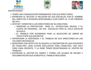 El documento describe las responsabilidades de jefes de sector, supervisores, directores de escuela, docentes y jefes de enseñanza en el proceso de selección de libros de texto para el próximo ciclo escolar a través del sistema CONALITEG. Cada grupo debe cumplir con tareas específicas como difundir información, registrar datos de escuelas y personal, seleccionar libros de texto, y asegurar la participación en talleres. El objetivo general es llevar a cabo el proceso de forma ordenada para el nuevo ciclo escol