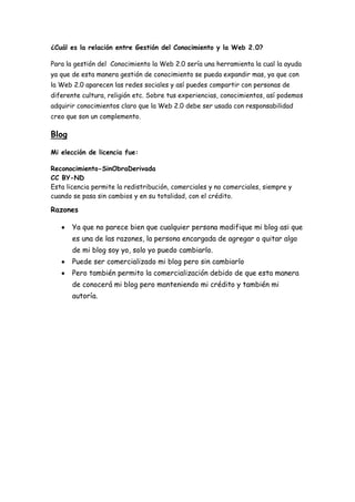La Web 2.0 puede ser una herramienta útil para la gestión del conocimiento al permitir compartir experiencias y conocimientos a través de redes sociales con personas de diferentes culturas y religiones. Sin embargo, la Web 2.0 debe usarse de manera responsable como un complemento para la gestión del conocimiento.