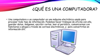 Este documento define varios términos clave relacionados con la computación, incluyendo computadora, CPU, WWW, dominio de Internet, navegador, hardware, software, RAM, impresora, bit y chat. Explica brevemente qué es cada uno de estos elementos y conceptos fundamentales de las computadoras.