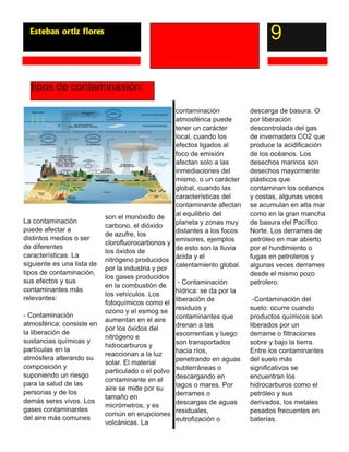 La contaminación puede afectar al aire, agua, suelo y océanos. Existen 9 tipos principales de contaminación: la atmosférica, que incluye gases de efecto invernadero; la hídrica, por residuos en ríos y mares; la marina, por desechos plásticos y derrames de petróleo; y la del suelo, por derrames químicos.