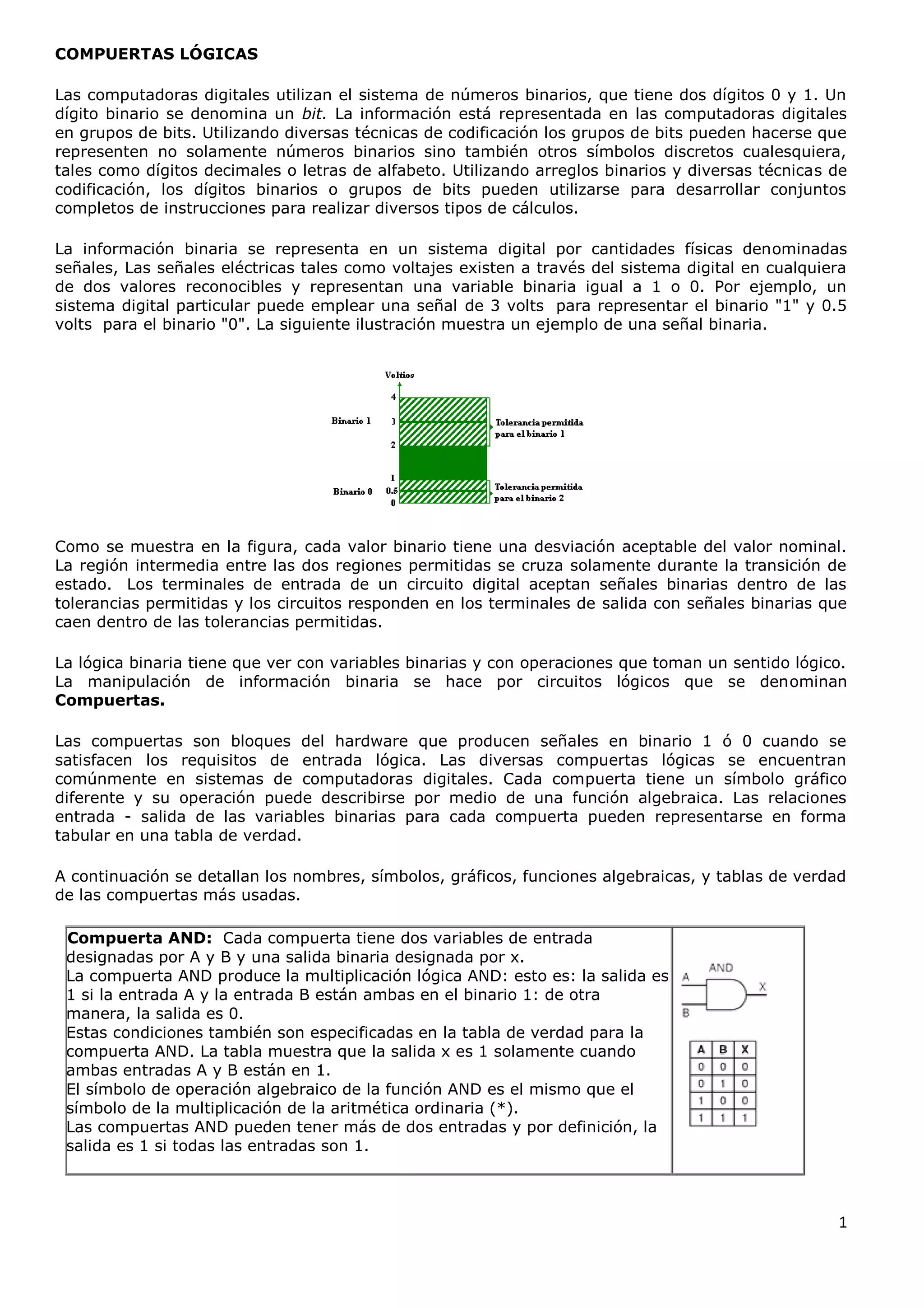 El documento describe las compuertas lógicas utilizadas en sistemas digitales. Explica que las computadoras usan números binarios representados por bits. Las compuertas lógicas como AND, OR y NOT manipulan estos bits de acuerdo a tablas de verdad para realizar operaciones lógicas. También describe compuertas combinadas como NAND y NOR.