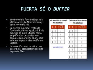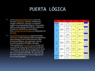 Las puertas lógicas son dispositivos electrónicos que realizan operaciones lógicas booleanas como AND, OR, NOT, XOR y XNOR. Claude Shannon experimentó con relés electromagnéticos para implementar las funciones lógicas básicas. Cada puerta lógica se representa por un símbolo y sigue una ecuación característica particular.