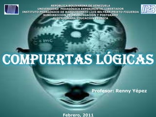 Este documento describe las diferentes compuertas lógicas, incluyendo AND, OR, NAND, NOR y NOT. Explica cómo cada compuerta funciona mediante tablas de verdad que muestran la salida lógica para todas las posibles combinaciones de las entradas lógicas. Las compuertas lógicas son dispositivos digitales fundamentales que forman la base de los circuitos digitales y sistemas de computación.