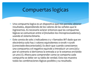 Este documento describe las diferentes compuertas lógicas, incluyendo buffer, NOT, AND, NAND, OR, NOR, XOR y XNOR. Explica que las compuertas lógicas se comunican usando el sistema binario de 0 y 1, y que cada compuerta tiene una tabla de verdad que muestra sus resultados de salida para todas las combinaciones posibles de entrada. Además, detalla las funciones de cada compuerta, como la multiplicación lógica de AND, la suma lógica de OR, y los comportamientos especiales de XOR y XNOR.