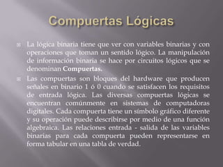 El documento describe conceptos básicos de lógica binaria y circuitos lógicos. Explica que las compuertas lógicas son bloques que producen señales binarias 1 o 0 en función de sus entradas y que se usan para implementar funciones lógicas en sistemas digitales. También resume que los microprocesadores contienen millones de transistores combinados para construir estructuras lógicas más complejas como sumadores y registros.