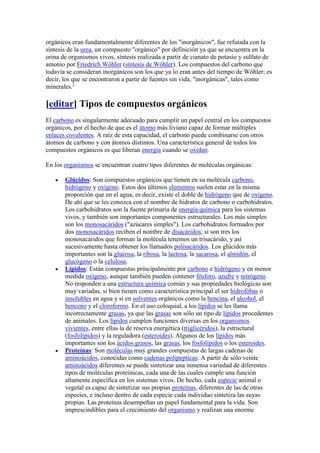 Los compuestos orgánicos son sustancias químicas que contienen carbono. Contienen carbono, hidrógeno, oxígeno y otros elementos. Las moléculas orgánicas pueden ser naturales, sintetizadas por seres vivos, o artificiales, fabricadas por humanos. Los cuatro tipos principales de moléculas orgánicas en organismos son glúcidos, lípidos, proteínas y ácidos nucleicos.