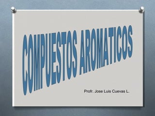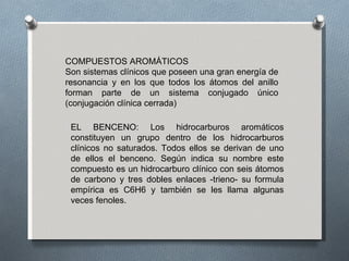 El documento describe los compuestos aromáticos, con un enfoque en el benceno. Explica que el benceno es un hidrocarburo aromático clínico con seis átomos de carbono y tres enlaces dobles alternados. También describe las formas comunes de representar la molécula de benceno y explica la nomenclatura y reacciones comunes de sustitución que ocurren en los compuestos aromáticos como la halogenación, nitración y alquilación.
