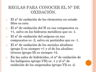 El documento resume las reglas básicas para determinar los números de oxidación de los elementos en compuestos inorgánicos. Explica que el número de oxidación representa la capacidad de un elemento para combinarse con otros y lista los estados de oxidación más comunes para cada grupo del sistema periódico. Además, describe los principales tipos de compuestos binarios como óxidos, peróxidos, hidruros y sales binarias, y resume sus nomenclaturas sistemática, de Stock y tradicional.