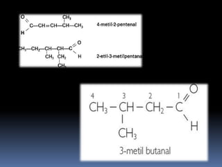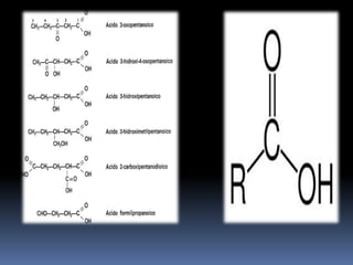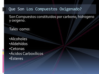 Este documento proporciona información sobre compuestos oxigenados como alcoholes, aldehídos, cetonas, ácidos carboxílicos y ésteres. Explica sus características químicas, clasificaciones y usos comunes. Los alcoholes contienen el grupo funcional -OH, los aldehídos contienen el grupo -CHO unido a un carbono primario, y las cetonas contienen el grupo carbonilo en un carbono secundario. Los ácidos carboxílicos contienen el grupo -COOH y los éster