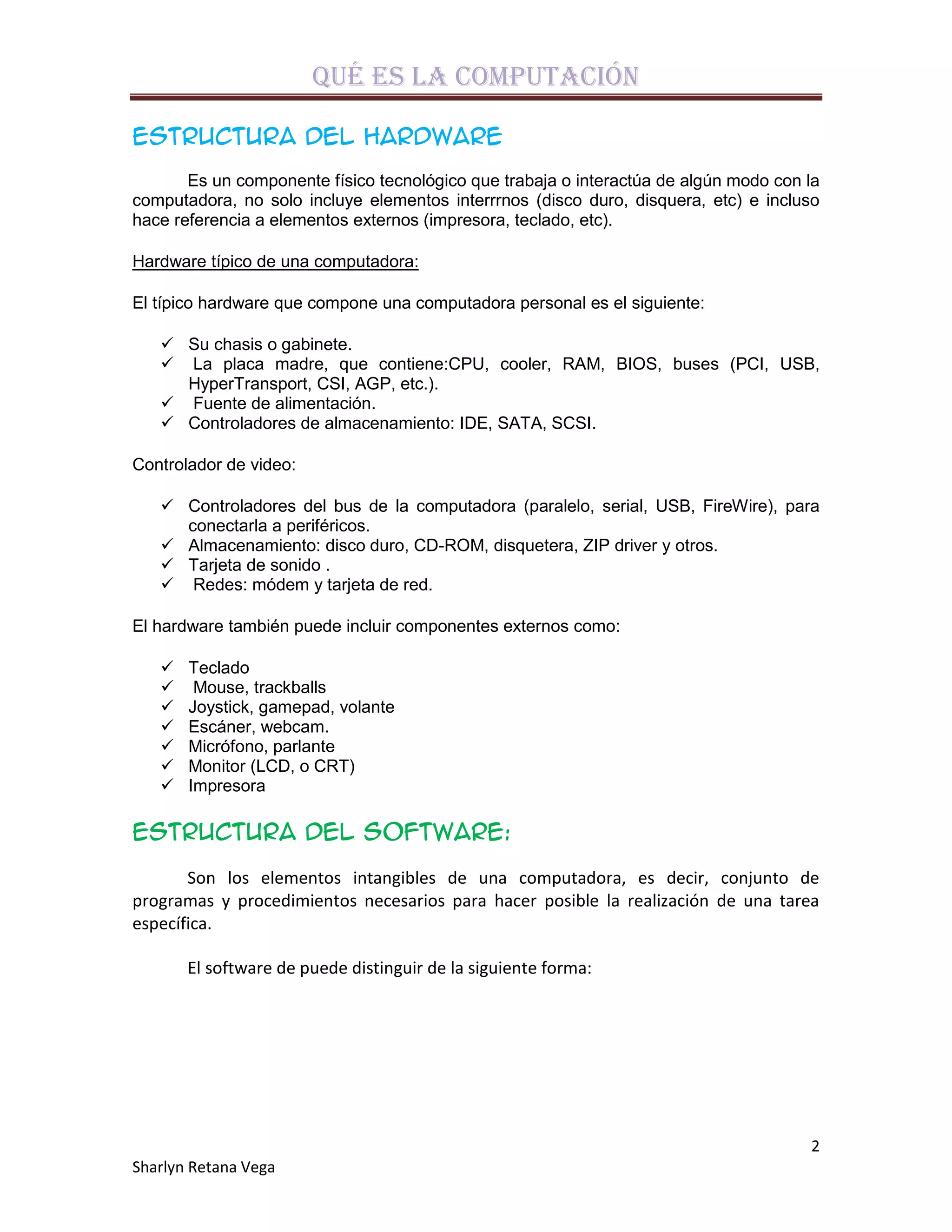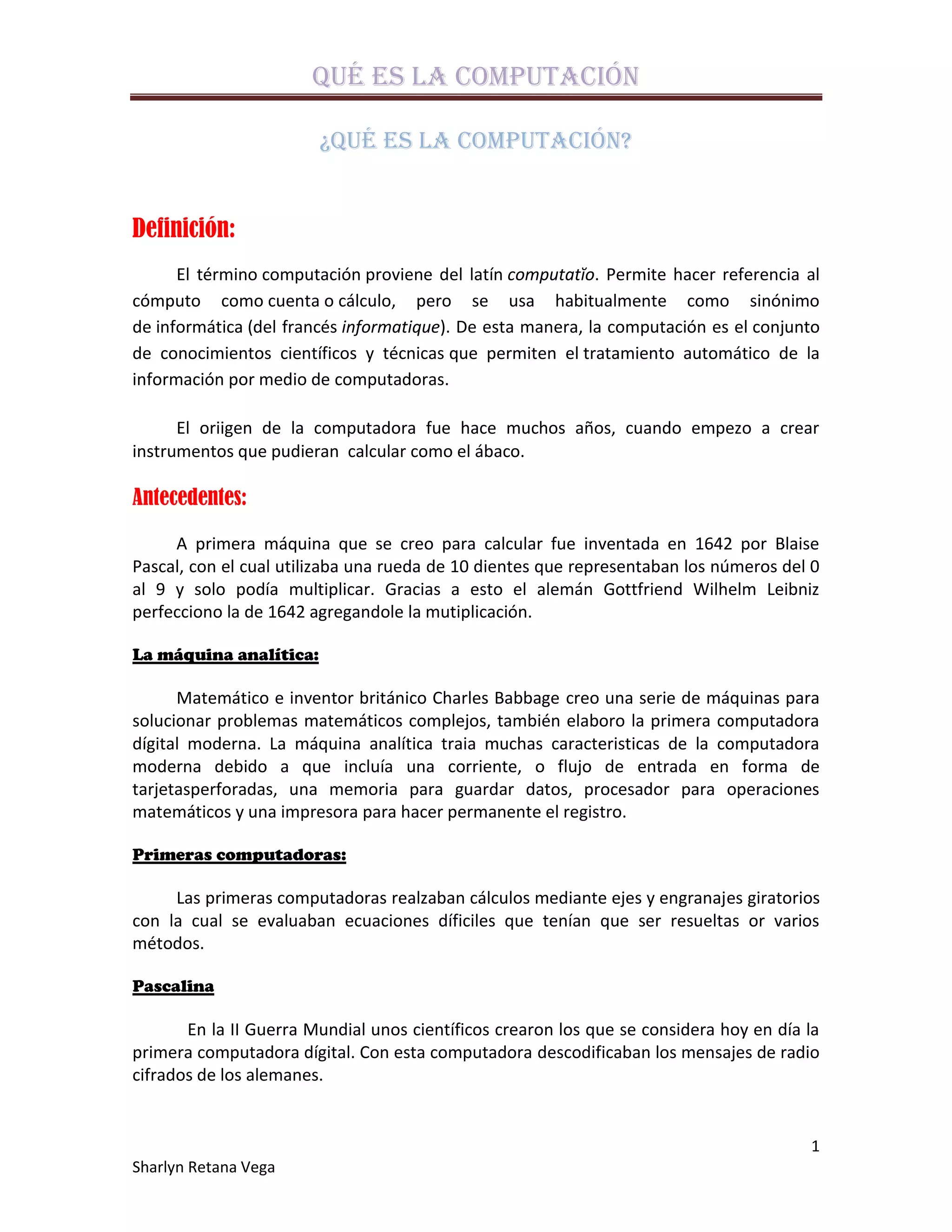 La computación se refiere al procesamiento automático de información por medio de computadoras. El documento explica que la computación surgió de los primeros intentos de crear máquinas para calcular como el ábaco. Luego, se mencionan algunas de las primeras computadoras creadas como la máquina analítica de Charles Babbage y las utilizadas para descifrar códigos durante la Segunda Guerra Mundial. Finalmente, se definen los componentes básicos del hardware y software de una computadora moderna.