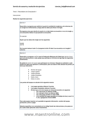 Este documento presenta una serie de ejercicios de programación en C++ sobre diferentes temas como arreglos, archivos de texto, clases y objetos, herencia y polimorfismo. Incluye instrucciones detalladas para cada ejercicio y solicita al estudiante enviar las soluciones en formato de reporte a su tutor.