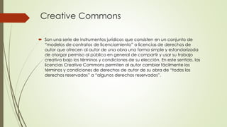 Creative Commons son una serie de licencias de derechos de autor que permiten a los autores cambiar fácilmente los términos de uso de su obra de "todos los derechos reservados" a "algunos derechos reservados". Existen varios tipos de licencias Creative Commons que permiten diferentes niveles de uso comercial y modificación de la obra original.